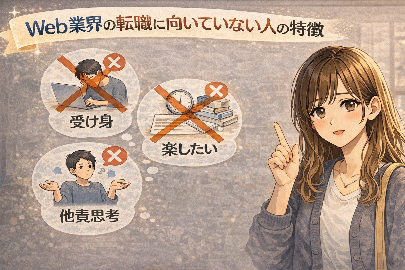 Web業界に行きたい。 でも、動けない。 その原因は、スキルや年齢より前に いくつかの「思い込み」であることが多いです。 これは能力の問題ではありません。 ただ、頭の中にずっと置いたままになっている前 ...